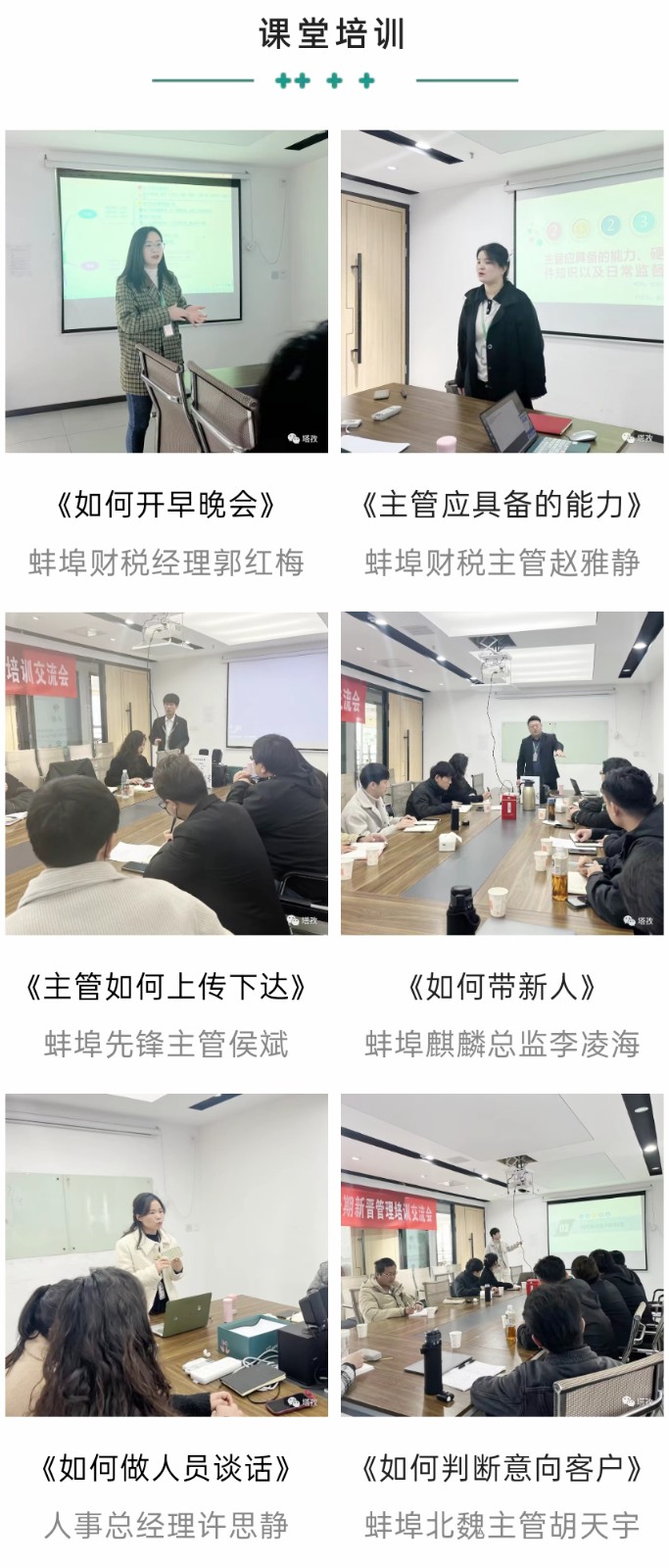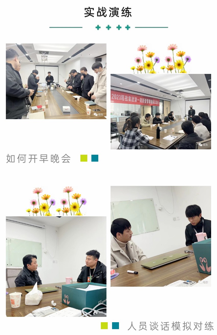 本次培訓課程干貨滿滿,圍繞“如何開早晚會”、“主管如何上傳下達”、“如何帶新人”、“如何判斷意向客戶”、“主管如何做日-周-月度規(guī)劃”等多個維度細致剖析了在塔孜公司一個管理者應具備的專業(yè)知識和技能,配合現(xiàn)場演練,統(tǒng)一規(guī)范管理動作,建立標準化運作模式。